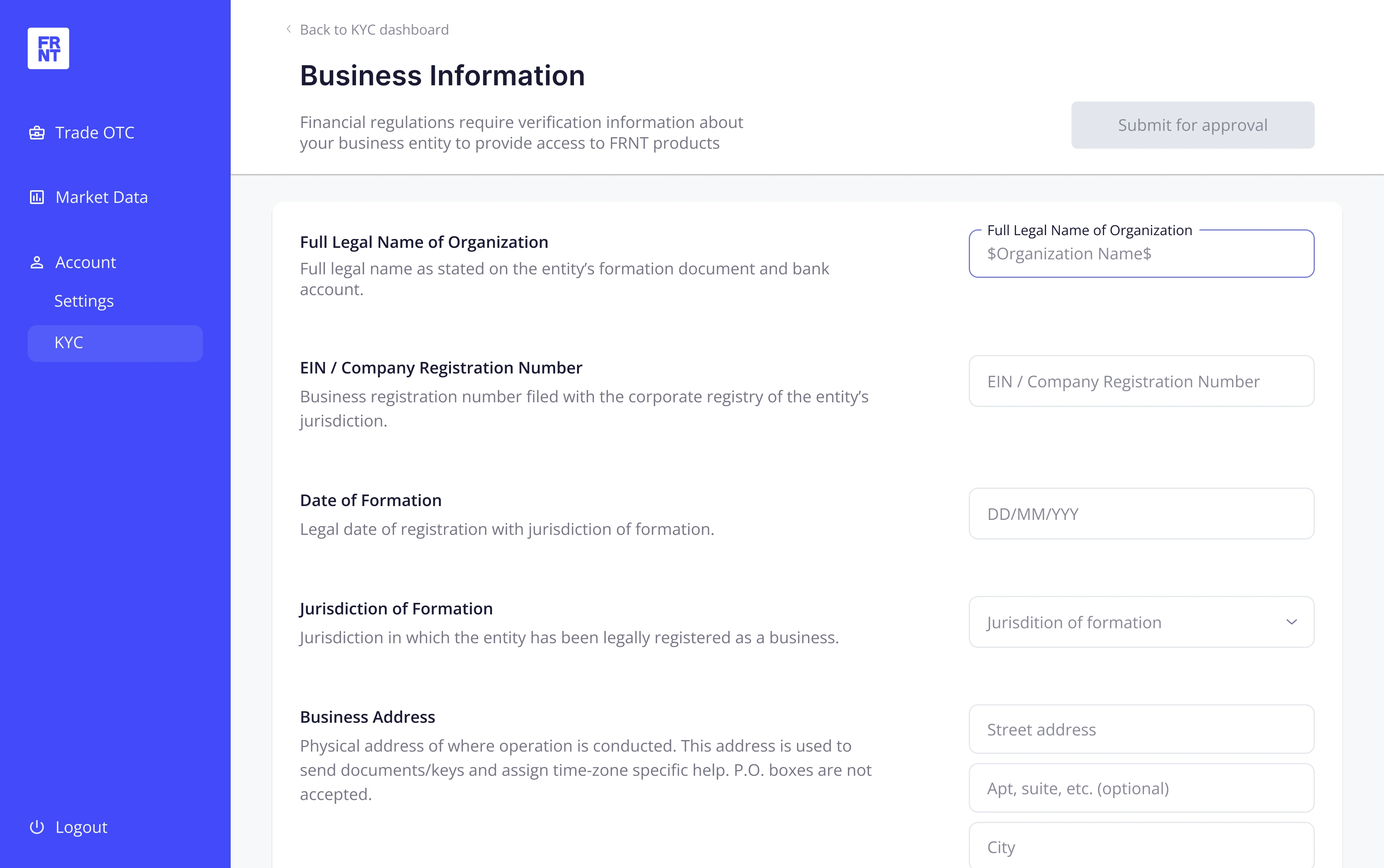I designed each KYC requirement with a short explanation of what information or document was needed, reducing ambiguity and helping prevent incorrect submissions. This approach saves time for both the client and FRNT during review while keeping the interface clear and easy to scan.